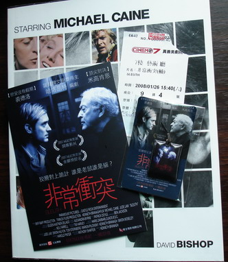![]() 票根、小傳單、預購贈品手機擦,背景則為《Starring Michael Caine》一書 |