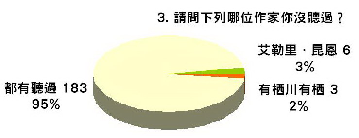 第三個問題是「請問下列哪位作家你沒聽過?」選項為艾勒里.昆恩、有栖川有栖、都有聽過、都沒聽過。本題設計之初用意為想看看是否有一位作者由於未被讀者所悉,所以在回答第一題的時候,就喪失了被選到的機會。後來發現這一題可以作為刪除錯誤樣本的工具,如填答者第一題回答會首先想到有栖川有栖,而本題回答沒聽過有栖川有栖這位作家,或是第一題回答艾勒里.昆恩,卻在這題回答沒聽過他,或是本題回答「都沒聽過」,則這些填答人的問卷就要抽掉,不列入最終計算。