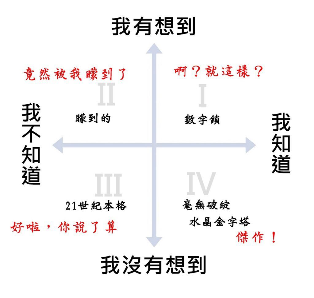 對我而言,第一象限「我知道,也有想到」的是到島田莊司的〈數字鎖〉,這種狀況讀小說就會感到十分無趣,因為作者據以設計詭計的知識我有,也被我看破了,讀來自然無趣;第二象限是「我不知道,但是我有想到」,基本上這種狀況不會發生,因為不知道,所以一定想不到,就算有,那也是矇到;第三象限是「我不知道,當然我也沒想到」的狀況,這種閱讀狀況會非常沒有參與感,既不知道作者賣弄的學問是啥,更不要說據以破案的可能性了,對我而言,許多號稱二十一世紀本格的推理小說就是這個樣子。
